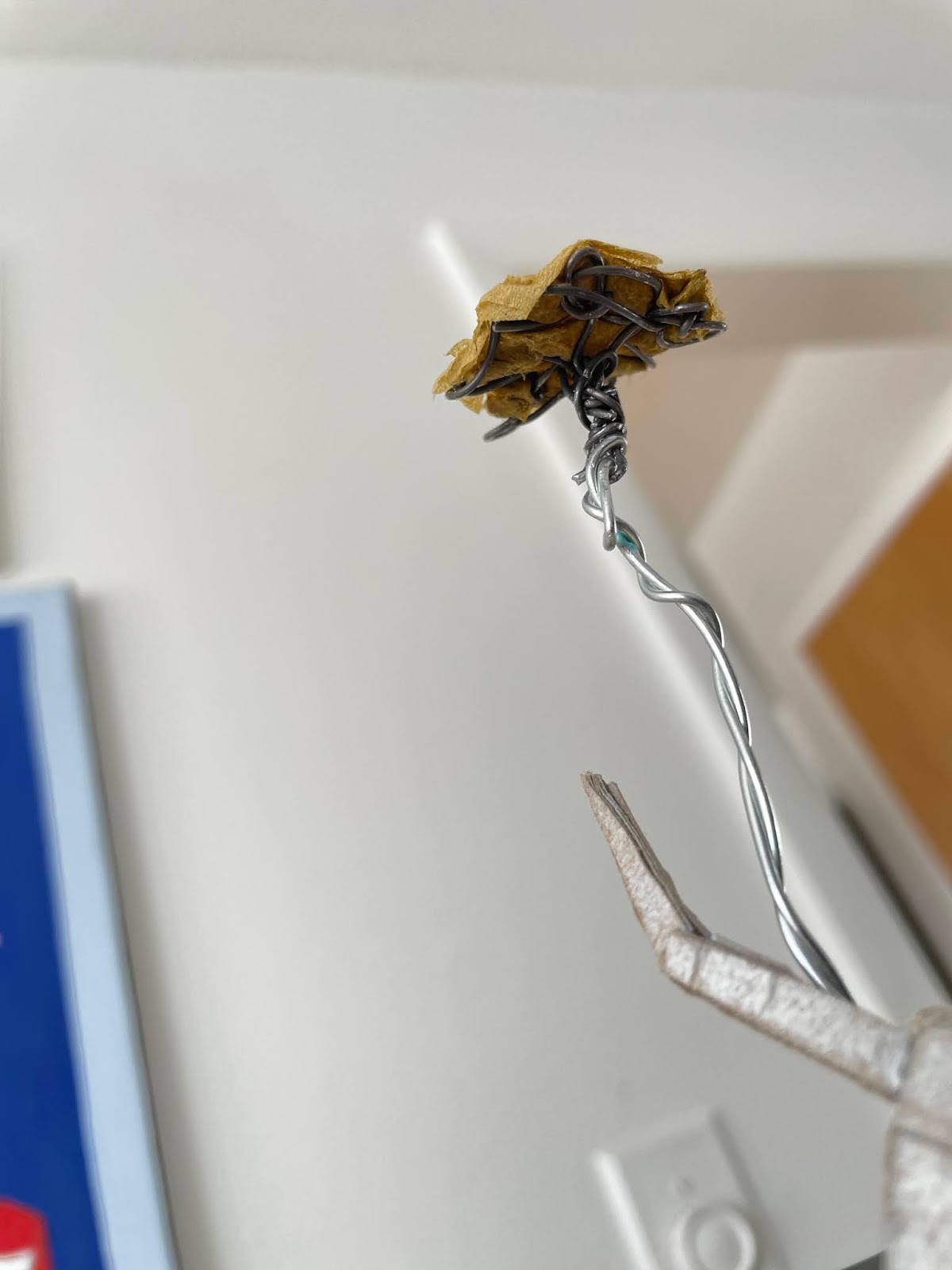 IDEA: I really love our wildflowers here in WY. My favorite one is Mountain Parsley. I think some people consider it a weed, but I love how it maintains its yellow color even into winter. I would like to create oversized wild flowers of different varieties and place them in different parts of Laramie...a little mountain parsley in one part of town, and indian paintbrush in another. I think these would probably be best suited for steal though. The little one I made is wire and cast paper.